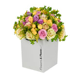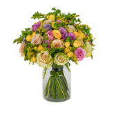 A radiant bouquet that captures the warmth of late summer afternoons. Velvety roses and delicate spray roses are lifted by clouds of golden solidago and the airy, jade-green stems of bupleurum